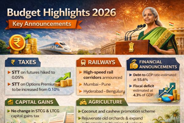Union Budget 2026 highlights key announcements on taxes, railways, MSMEs, agriculture, jobs, infrastructure, healthcare, & education...